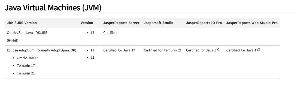 As for JDK versions - JRS needs to be compiled with Java compliance level 1.8. I've verified that this works with JDK versions 1.8 or 11, but not 17. You can run a JasperReports server on Java 17, although there is a bug where you can't import an exported repository if the repository had any report schedules in it. Apart from that, everything works, though. Java 17 is officially supported after all. Java 1.8 and 11 also work, of course, and without that export bug.
